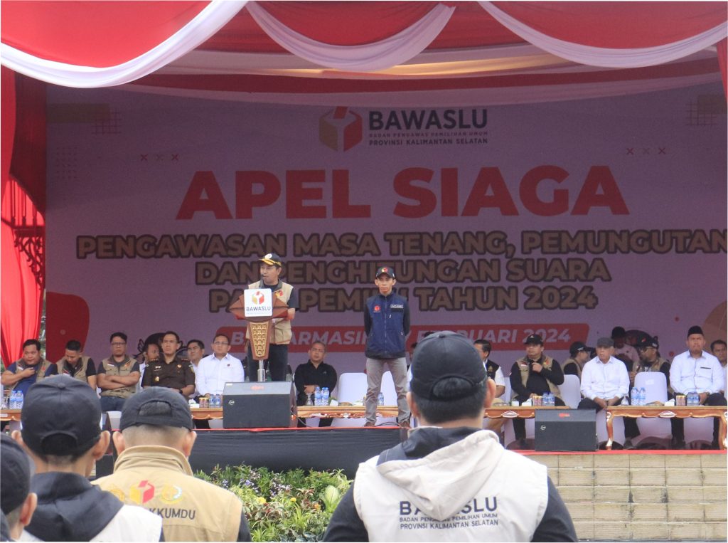\n\n\n\nKetua Bawaslu Kalimantan Selatan, Aris Mardiono memaparkan, Apel siaga digelar bermaksud untuk menyatukan langkah serta semangat dalam menghadapi puncak pemilu serentak 2024 yang dilaksanakan pada Rabu (14/2/2024) nanti. “Tiga hari lagi masa kampanye akan berakhir, maka dari itu kita harus ekstra siaga dalam menjaga kedamaian, kejujuran dan ketentraman selama kampanye ini masih berlangsung,” paparnya.