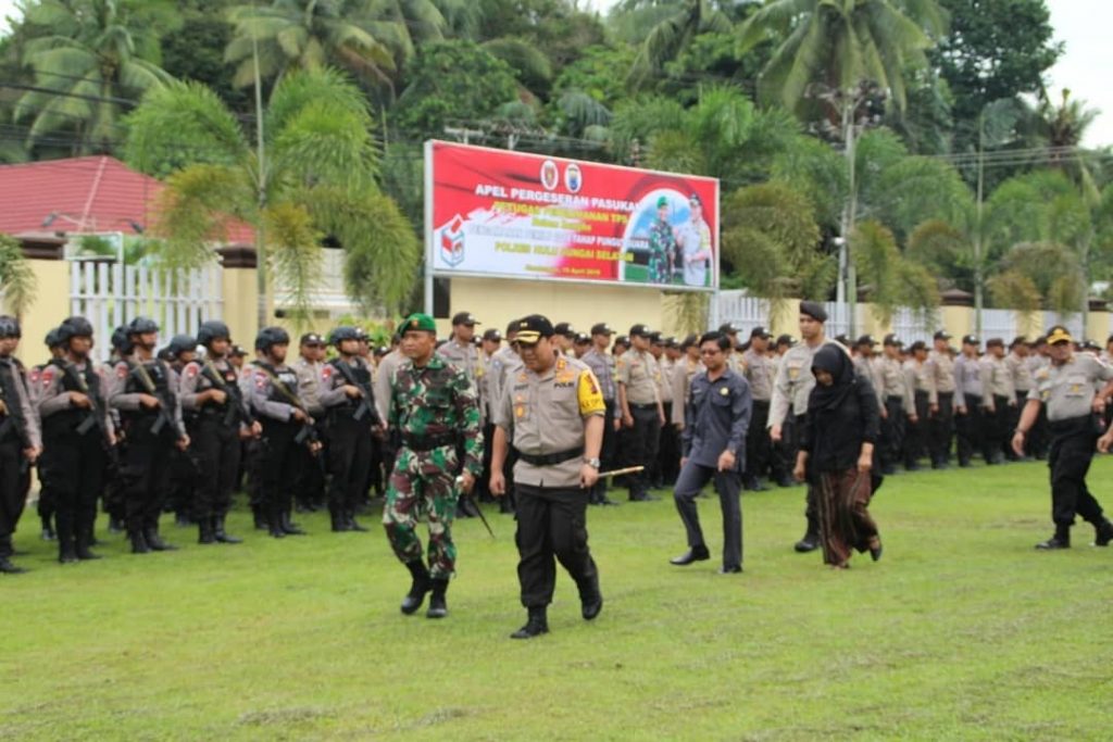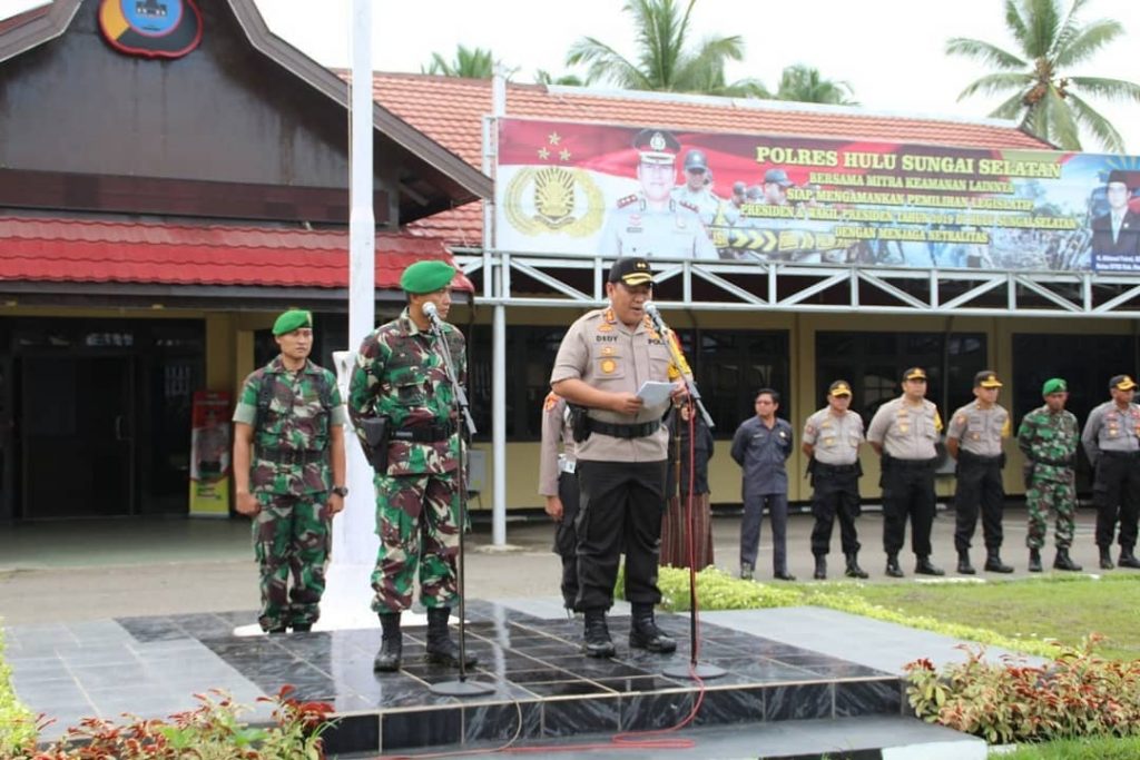 BawasluHSS diwakili Ketua Bawaslu Kabupaten Hulu Sungai Selatan Hasnan Fauzan, M.Pd.I, Menghadiri Kegiatan Apel Pergeseran Pasukan Petugas Pengamanan TPS dalam Rangka Pengamanan Pemilu 2019 Tahapan Pemungutan Suara yang dipimpin oleh Kapolres Hulu Sungai Selatan AKBP DEDY EKA JAYA H,SIK, MH, dan Dandim 1003 Kandangan Letkol Inf SUHARDI AJI WIJAYANTO, SE. Ketua KPU Kabupaten Hulu Sungai Selatan NIDA GUSLAILI RAHMADINA jua berhadir.