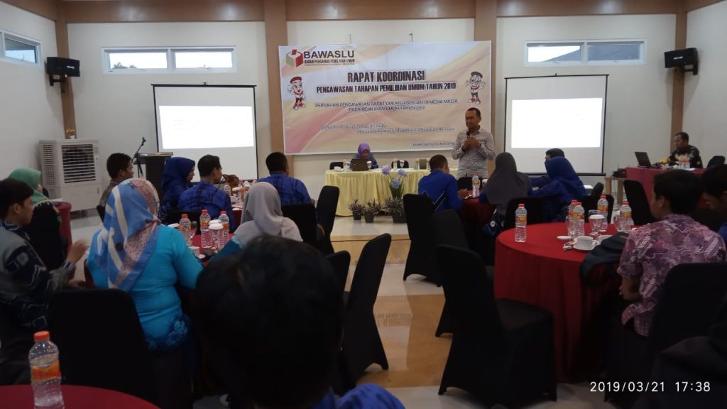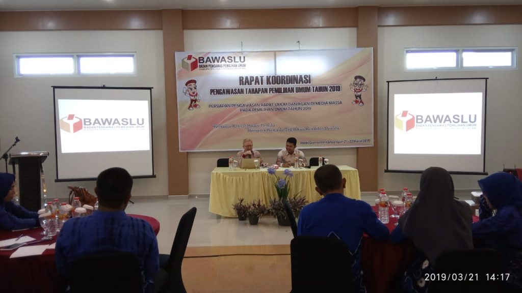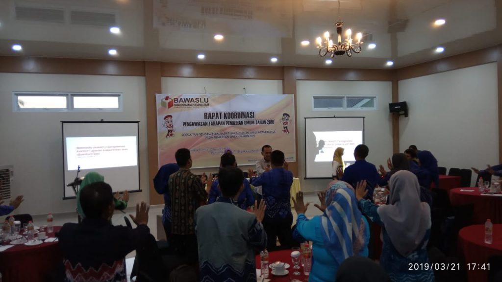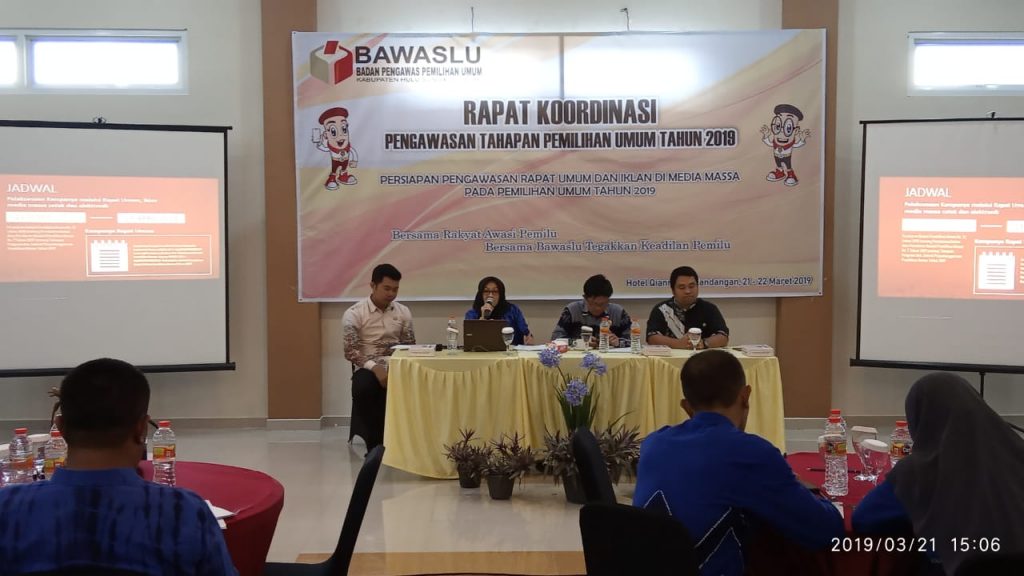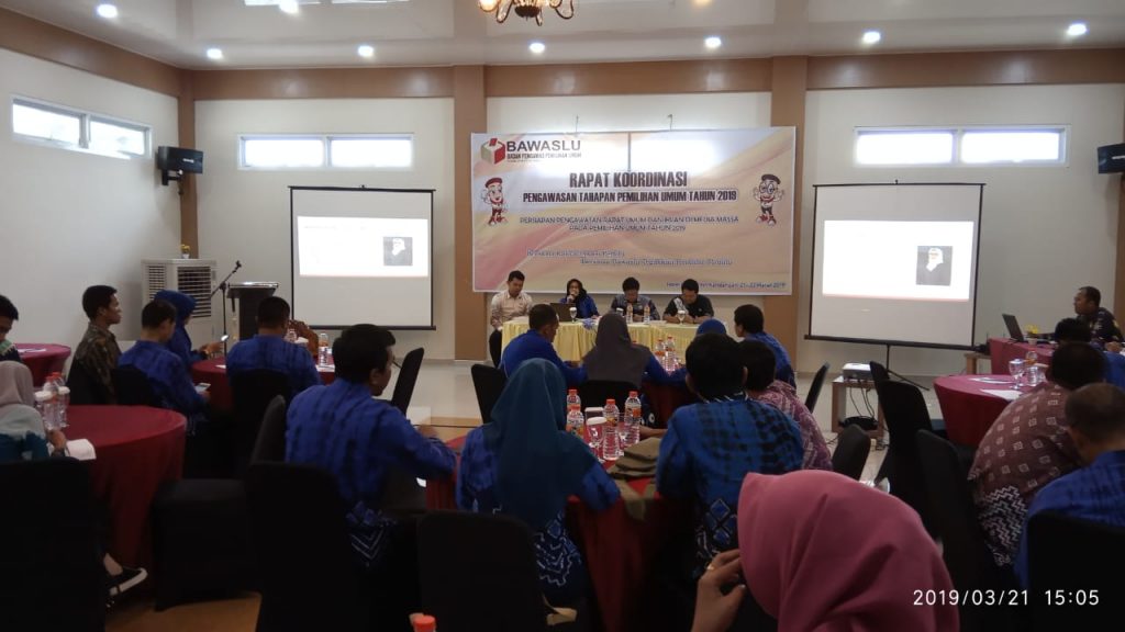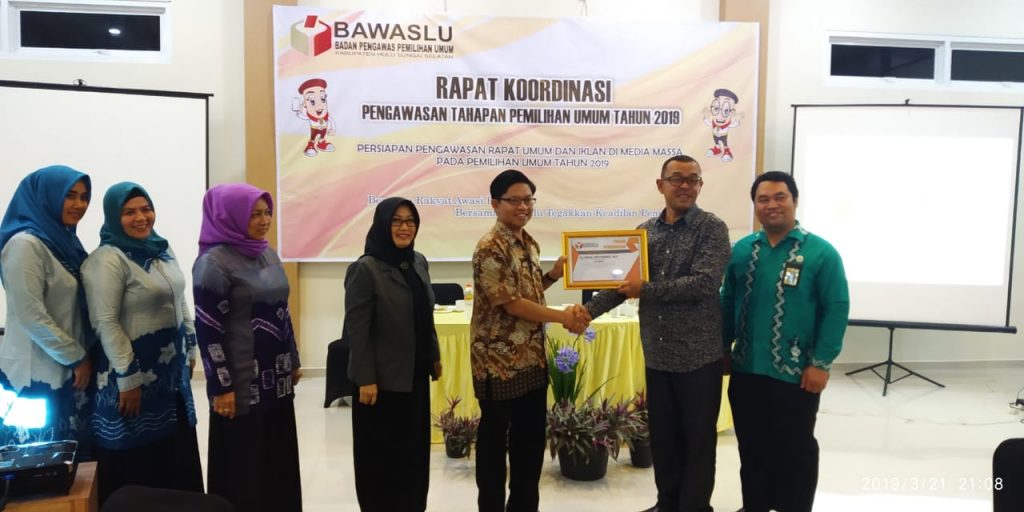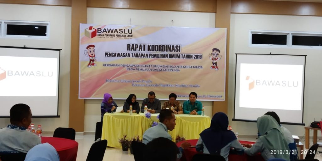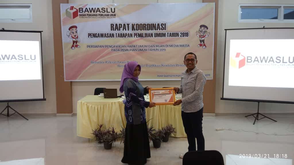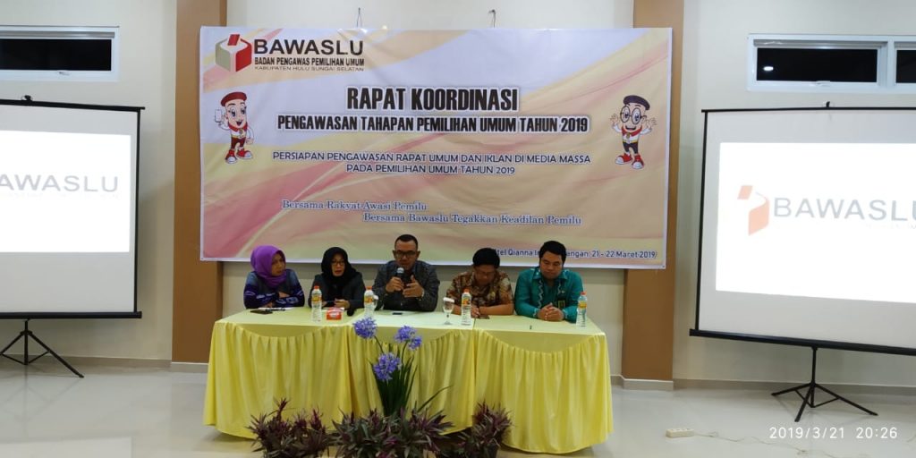 Jumat, 22 Maret 2019, BawasluHSS melaksanakan Rapat Koordinasi Pengawasan Tahapan Pemilihan Umum Tahun 2019, dengan Tema Persiapan Pengawasan Rapat Umum dan Iklan di Media Massa Pada Pemilihan Umum Tahun 2019". Dilaksanakan di hotel Qianna Kandangan tanggal 21-22 Maret 2019.