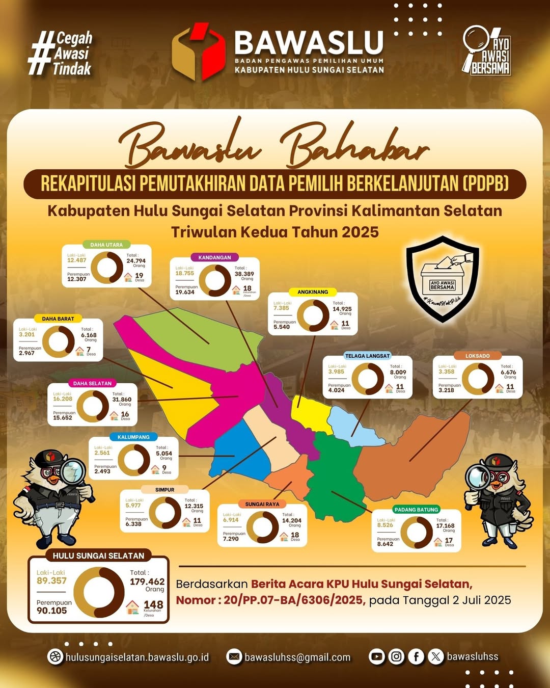 Berikut hasil rapat pleno rekapitulasi pemutakhiran data pemilih berkelanjutan (PDPB) triwulan II Tahun 2025, Berdasarkan Berita Acara KPU Hulu Sungai Selatan, Nomor : 20/PP.07-BA/6306/2025, pada Tanggal 2 Juli 2025